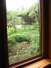 窓の向こうからやってきた我が家を眺めているお店の人が