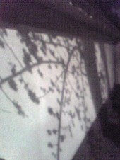 見ると、近所の路地のお寺の塀に寒桜の影。